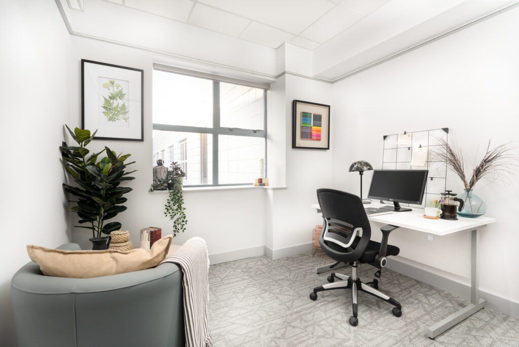 A modern and light 100 sq ft office space comfortably accommodating 1 desk. Our 1 desk offices are a great option for business owners and virtual workers opting to work away from their home environment. Enjoy the peace and quiet of your own office but be sure to make use of the fabulous shared kitchen area and bookable meeting rooms - you’ll get 2 hours per week included in the price. 1 parking space is included